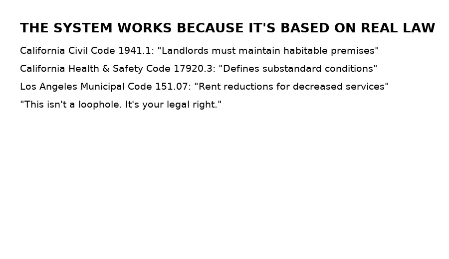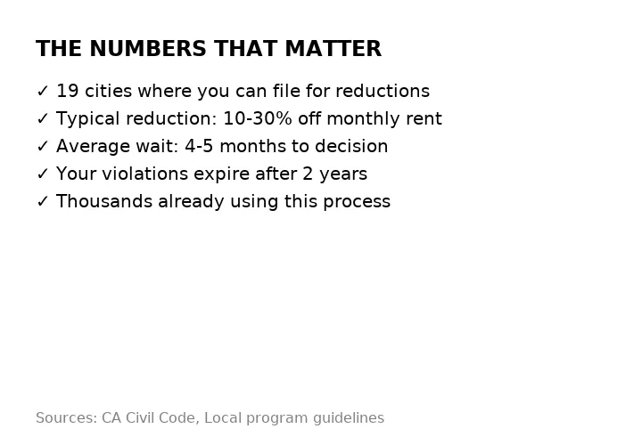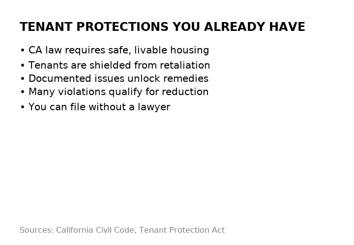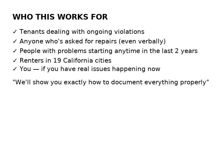 Even if you're outside those 19 cities but still under rent control, you’ll gain powerful documentation tools and legal organization strategies that strengthen any habitability dispute.